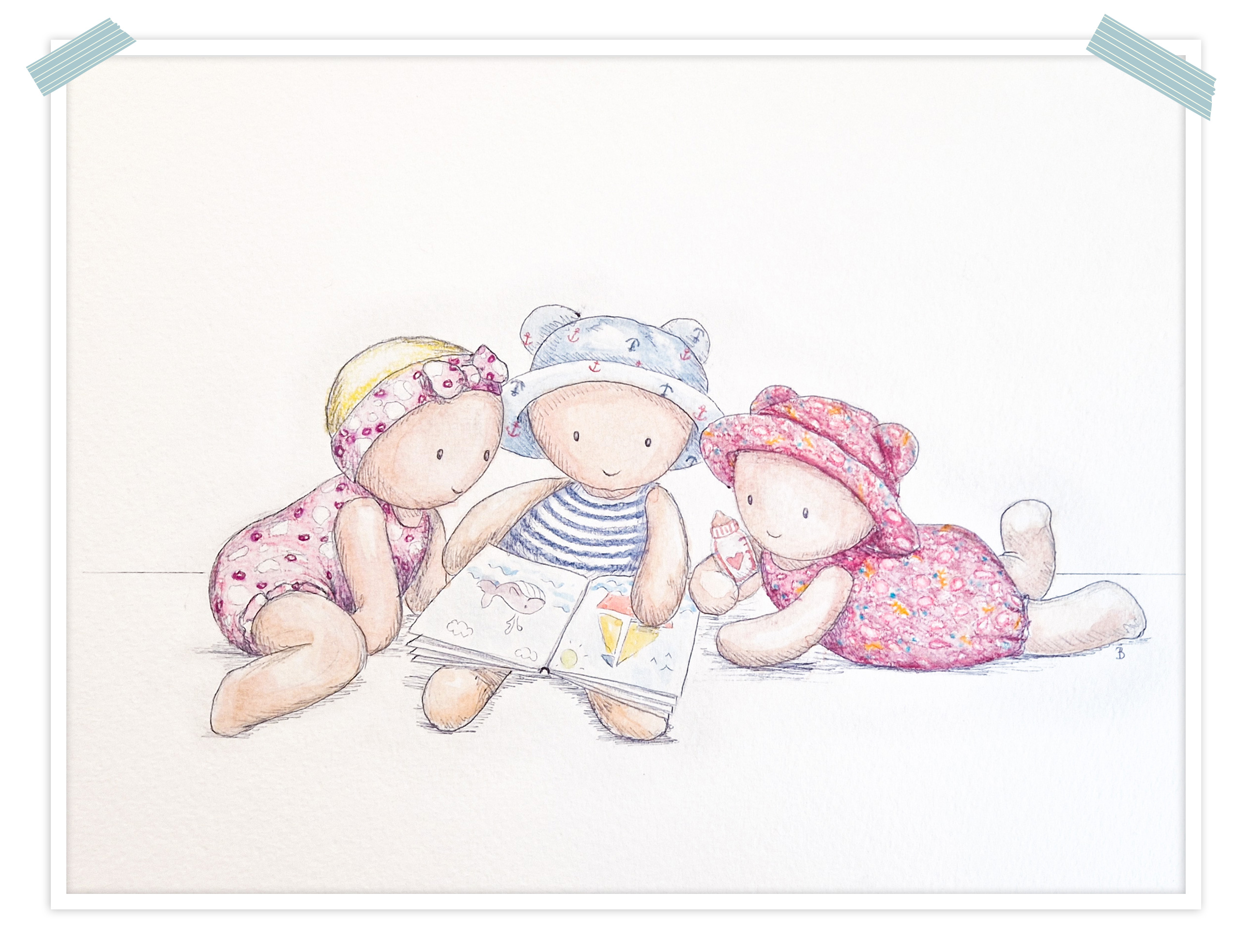 Maëlle et Marylou, attirées par les jolies images, se joignent à eux. Les poupons prêtent une grande attention aux illustrations.