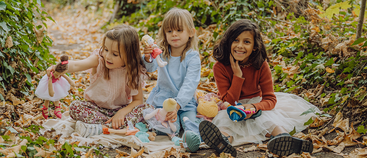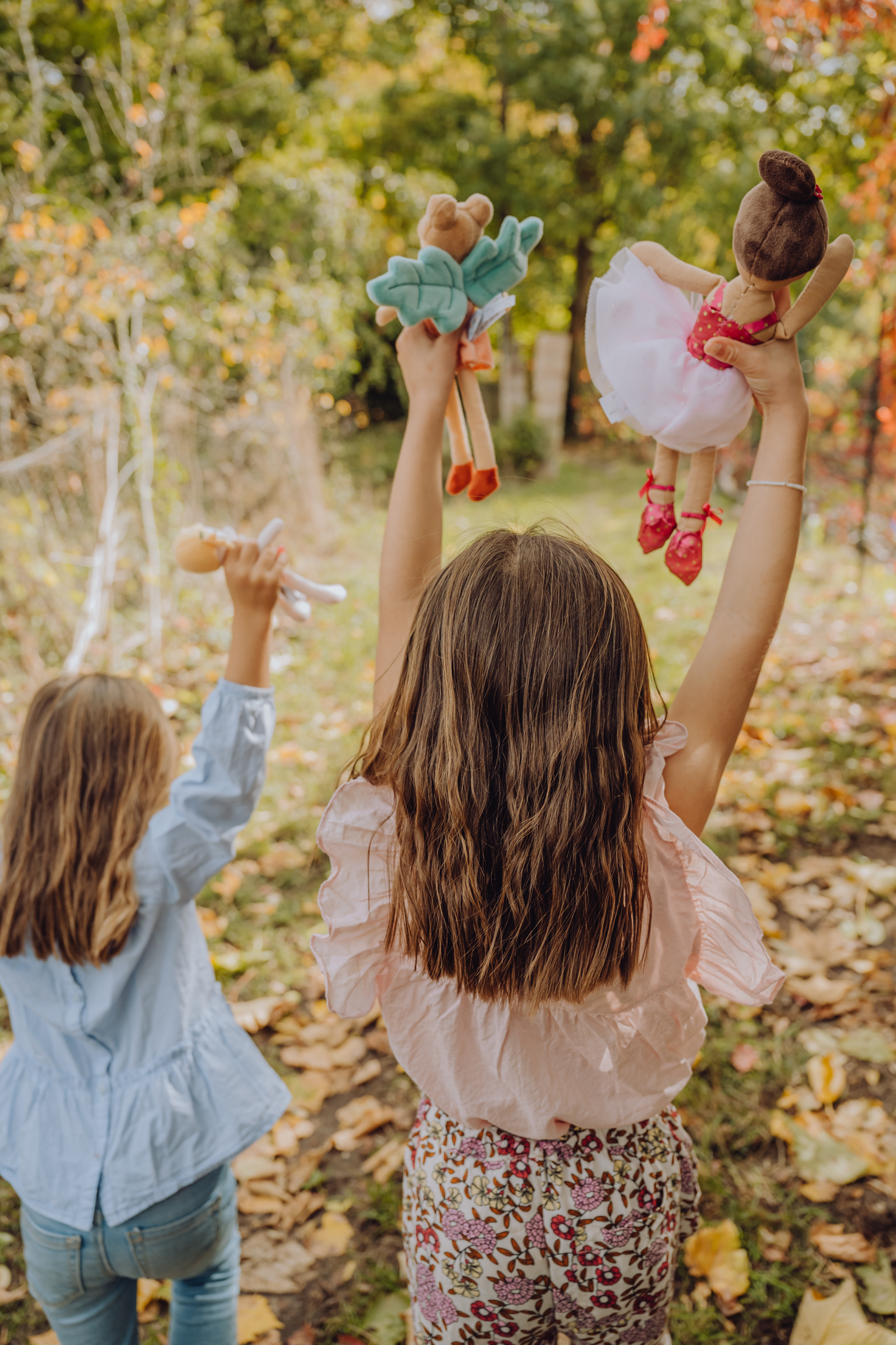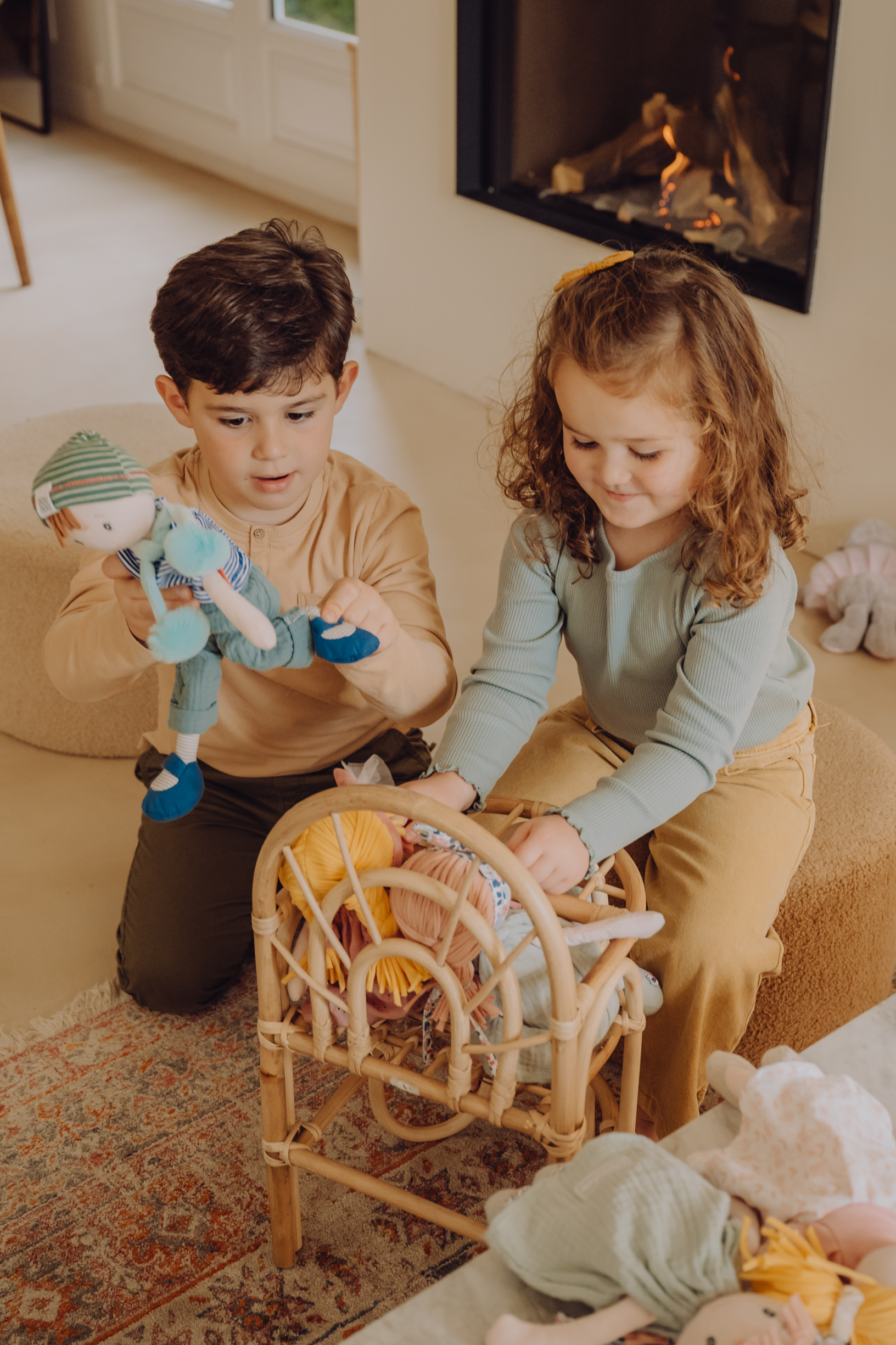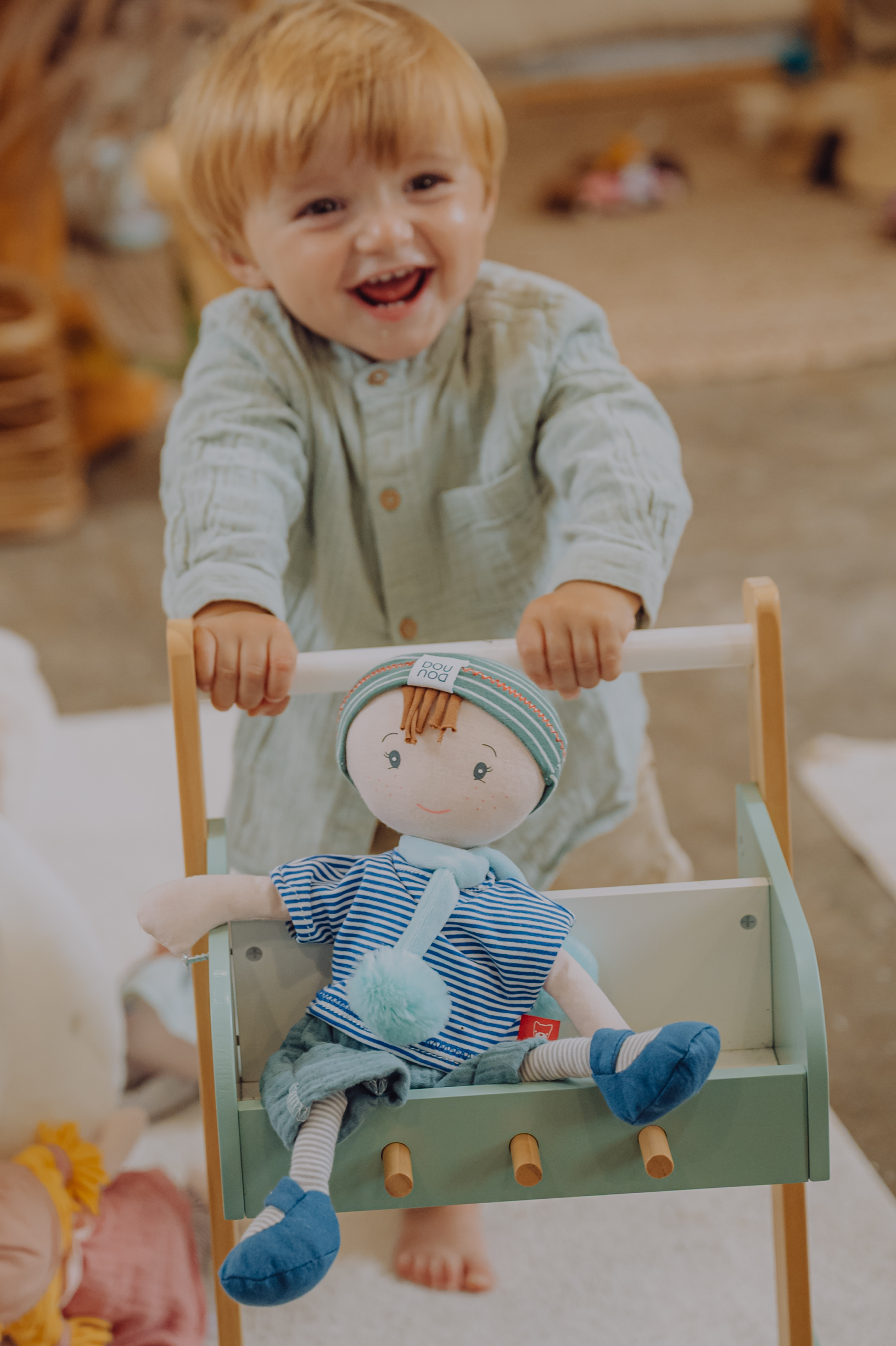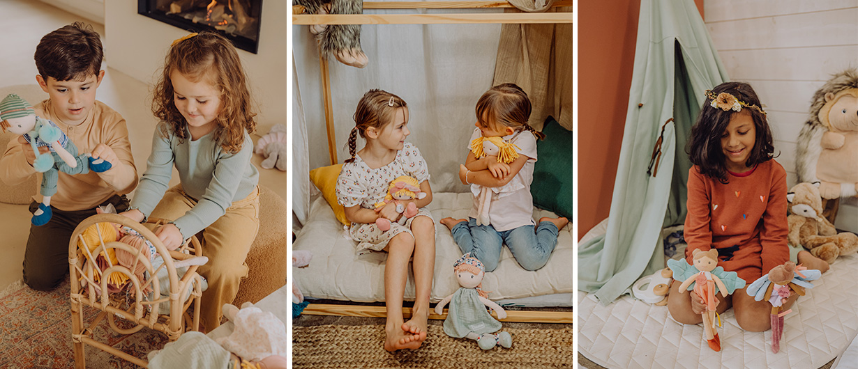 Tandis que le Doudou est unique dans le quotidien de l’enfant, il nous a paru tout naturel de travailler la poupée de chiffon, souple et légère pour répondre à tous les besoins essentiels dans le développement des enfants entre 0 et 3 ans, mais aussi d'imaginer des poupées à jouer jusqu'à 7-8 ans.