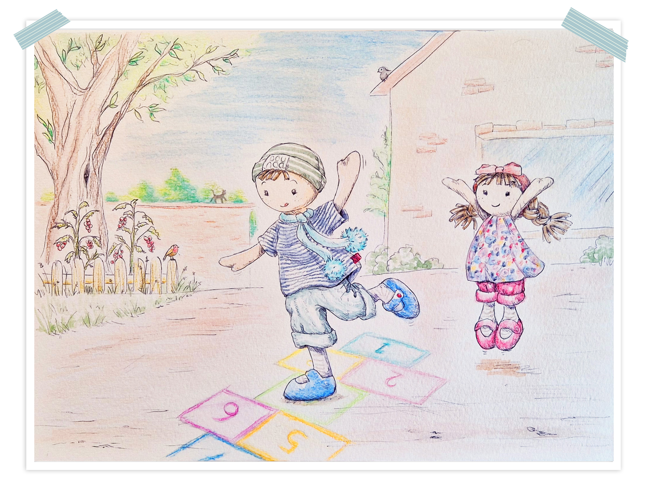 Je cours voir la marelle de toutes les couleurs avec Lulubelle et Capucine. Evy est déjà là et je vois Faustin, au loin, qui nous rejoint.